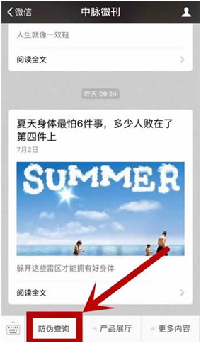 而后,通过文末图片中的二维码关注中脉的官方微信公众号中脉微刊,进入公众号,点击左下角菜单栏的“防伪查询”;