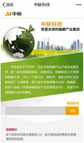 面对市场上的众多假货,中脉科技想尽办法让更多消费者不被假货欺骗,因而推出了产品防伪系统,消费者直接通过手机关注中脉微刊微信公众号,在公众号中就能识别真假中脉产品了!