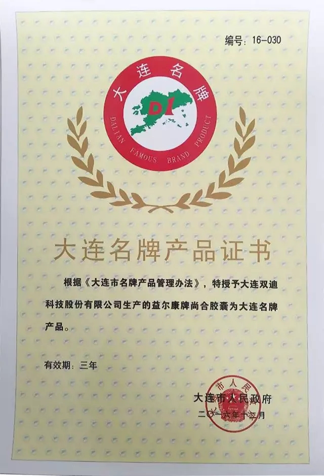 又一喜讯,根据《大连市名牌管理办法》,大连双迪科技股份有限公司生产的益尔康牌尚合胶囊被评选为大连名牌产品。