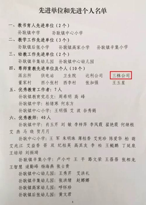 2017年9月8日,在第33个教师节来临之际,中共济阳县孙耿镇委员会和孙耿镇人民政府联合下发了《关于表彰2016—2017学年度教育工作先进单位和先进个人决定》的文件,对于在提升孙耿镇教育教学水平,促进镇域义务教育均衡发展方面做出重要贡献的先进单位和先进个人予以隆重通报奖励,三株集团被授予“尊师重教先进单位”荣誉称号。