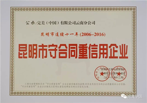 近日,凭借良好的企业信用,完美云南分公司荣获由昆明市工商行政管理局、市合同信用促进会颁发的“连续十一年(2006-2016)昆明市守合同重信用企业”荣誉称号。同时,云南分公司还获得云南省工商行政管理局颁发“2014-2015年度守合同重信用企业”荣誉称号。