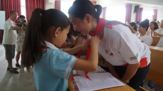 新州第三小学的学生为嘉宾系上红领巾
