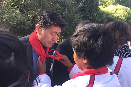 为远道而来的嘉宾带上红领巾