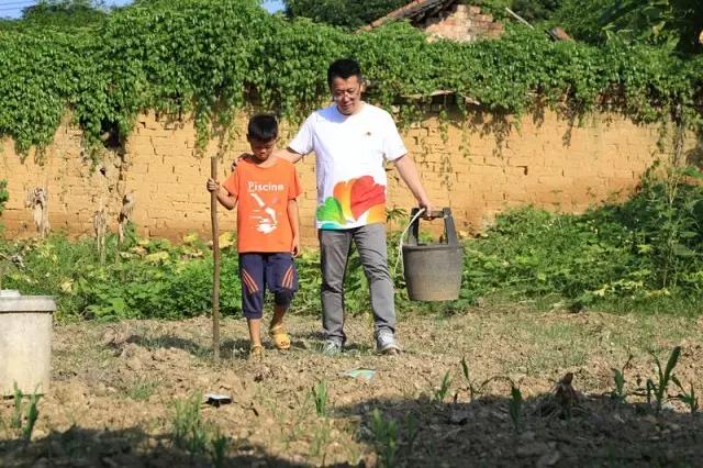 中脉公益基金会理事、中脉科技美体事业部执行副总裁邵健陪同孩子干农活