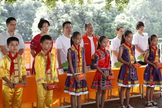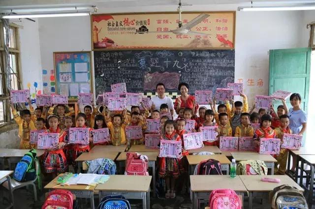 文具发放完毕的领导与学生们