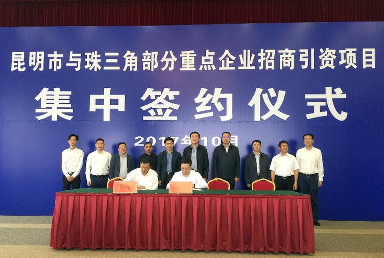 10月12日,昆明市与珠三角部分重点企业招商引资项目集体签约仪式举行。昆明市委副书记、市长王喜良带队指导的招商引资项目,包括康美药业、广东奥飞数据科技股份有限公司、深圳百果园实业发展有限公司等数家行业领军企业均进行签约仪式。