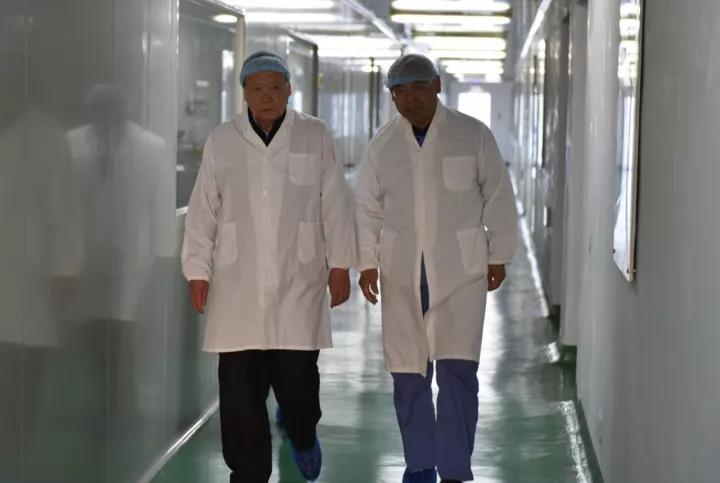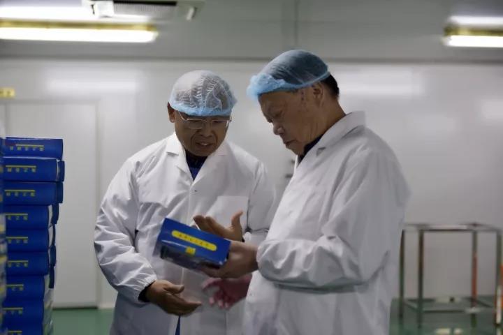 (国家卫生部原副部长殷大奎在海之圣生产基地总经理李强的陪同下参观生产车间)