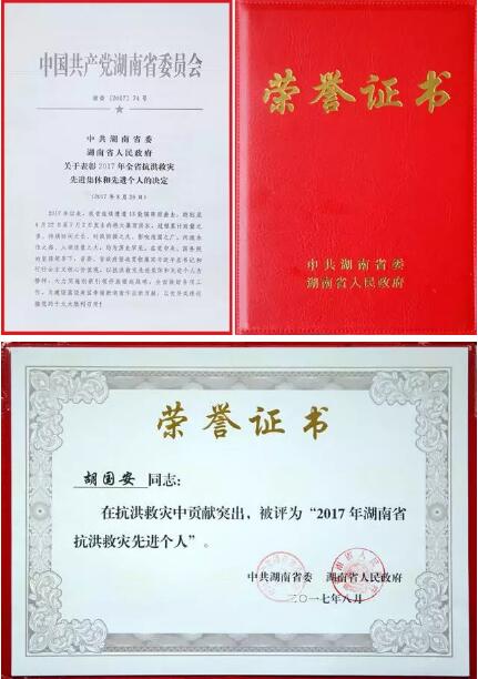 胡国安获“2017湖南抗洪救灾先进个人”称号