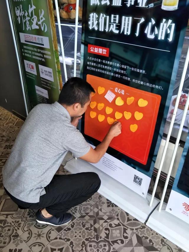 “SEED启源公益”是由启德国际控股有限公司发起,旗下尚睿·淳咖啡实施的公益活动,消费者只要在全国任意尚睿·淳咖啡门店任意消费后,在门店爱心墙上留下一张写下祝福的“爱心便签”,这样,城市服务人员就可以在门店领取到“免费饮品”。无附加条件,一个简单的动作就能献出爱心。
