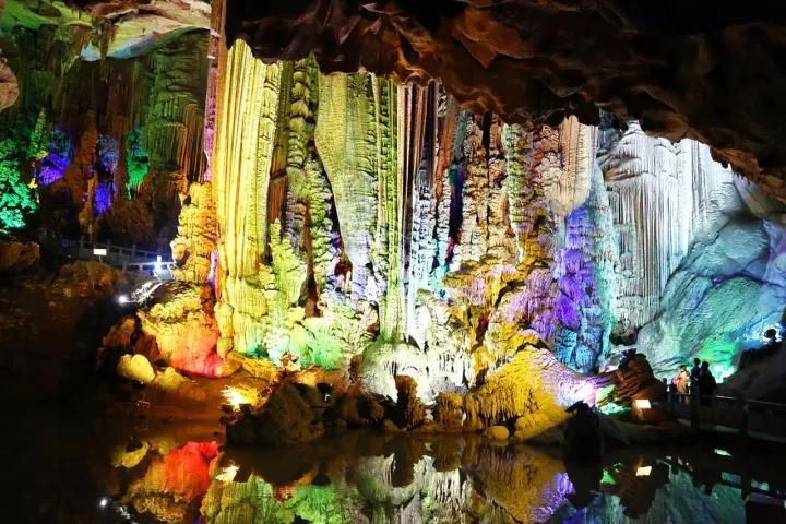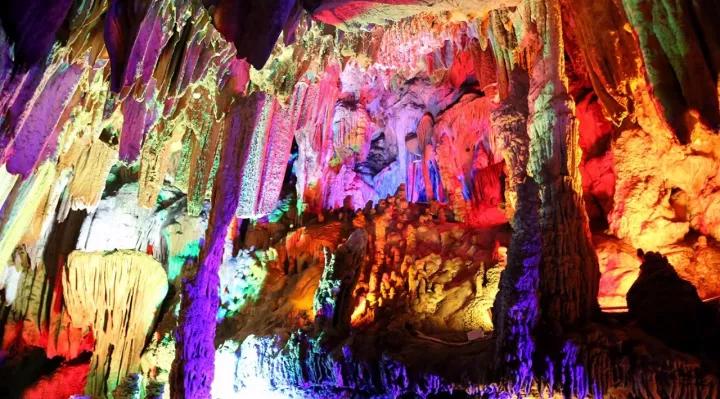 走进银子岩,如水般的清凉和平静扑面而来;明白了栩栩如生、惟妙惟肖、巧夺天工。赞叹、惊讶、紧张,银子岩的钟乳石奇形怪状,在各色灯光的照射下,一条条石笋上就像缀满了银粉,白的像一块块玉石,红的似一簇簇珊瑚,绿的若一片片翡翠,黄的如一颗颗琥珀。灯光与天然的石笋融为一体,好一个人间仙境。