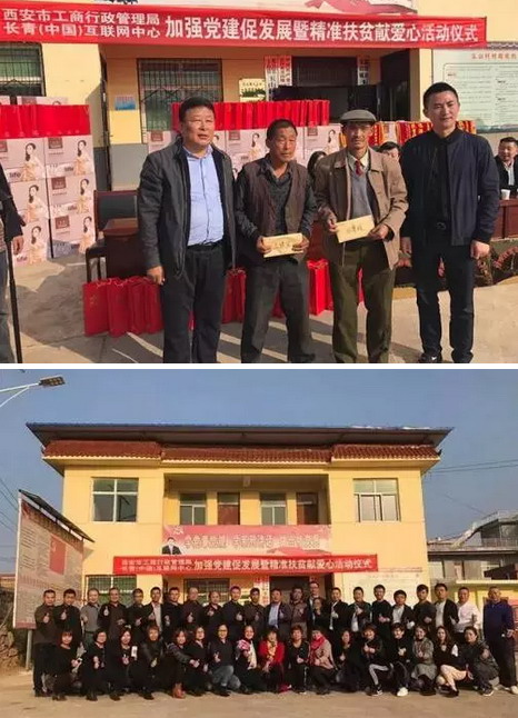10月27日,在重阳节来临之际,西安市工商行政管理局联合长青陕西分公司和长青(中国)互联网中心在蓝田县玉山镇玉山村共同举行了“加强党建促发展精准扶贫献爱心”活动,长青(中国)互联网战略合作方——金窝窝集团党支部书记云纪鑫先生,长青互联网优秀社群领导童晓峰、任东辉先生等领导一同参加了此次精准扶贫公益活动,为当地村民捐赠物品及帮扶金。同时在西安市工商行政管理局驻村干部毛书记带领下,走访慰问了当地特别贫困户及90岁以上的高龄老人,为他们送去了冬季所需物品(保暖内衣、棉被等)及慰问金。