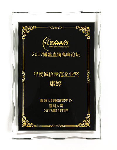 在此次高峰论坛中,康婷公司凭借良好口碑荣获2017博鳌直销高峰论坛“年度诚信示范企业”奖。为消费者提供高品质产品乃诚信之本,康婷始终秉承“诚实、守信、求质、创新”的经营理念,立足自主研发,坚持“诚信经营、品质至上”,严格把控生产的每个环节和每道工序,时刻保证为消费者提供安全可靠、质量上乘的产品,用实际行动践行立业之本——诚信。
