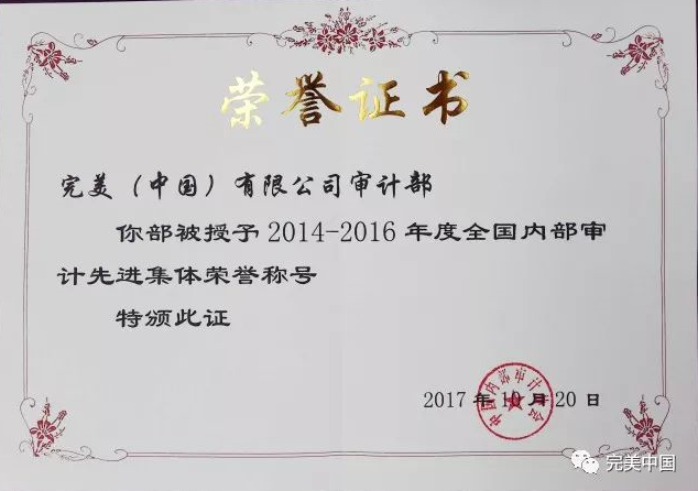 完美公司是广东省和中山市内部审计协会理事单位,公司分别于2010年和2012年荣获中山市审计局授予“全市内部审计工作先进集体”和“全市内部审计工作量化考评优秀单位”,2016年获评“2013-2015年度广东省内部控制建设标杆企业”荣誉称号。