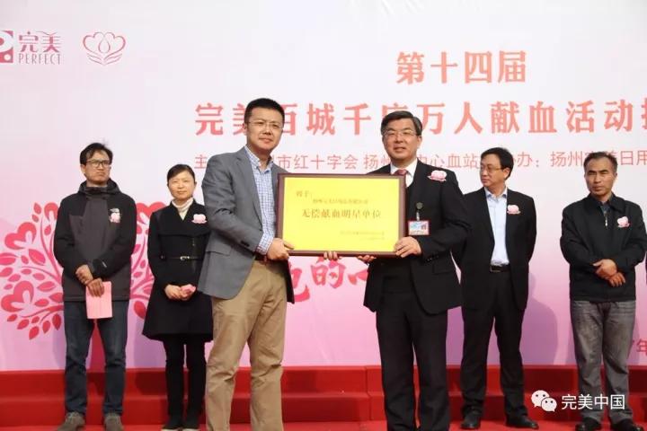 扬州完美被授予“无偿献血明星单位”荣誉牌匾