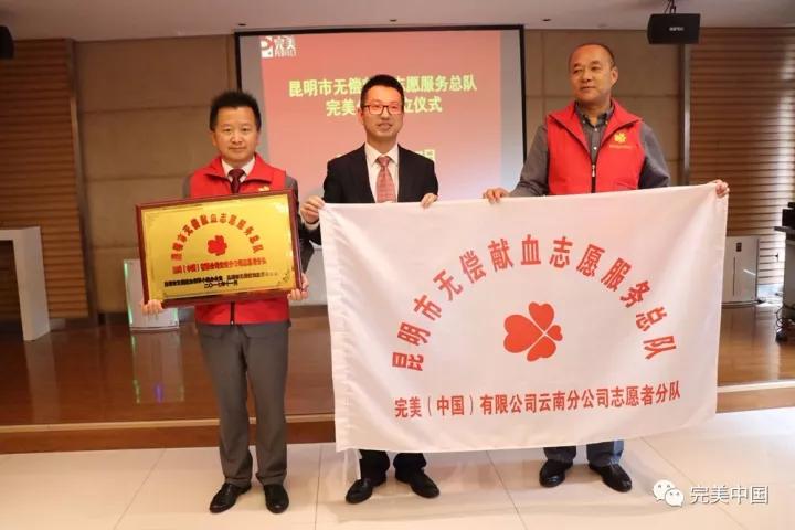 仪式现场,云南昆明血液中心、昆明市无偿献血志愿者协会相关领导向新成立的“完美分队”授旗授牌。今后,完美分队不仅承担着志愿服务的功能,还将开展无偿献血宣传、招募、培训等服务。此外,遍布全昆明市七区六县一市(安宁)的100多家完美服务中心将同时成为昆明市无偿献血志愿者协会招募站,将带动更多志愿者加入、壮大爱心队伍,从而推动无偿献血事业向更加规范化和专业化的道路前进!