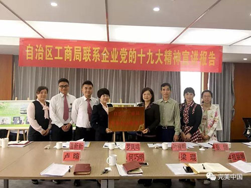 日前,广西壮族自治区工商局副巡视员罗凤鸣一行莅临完美广西分公司开展党的十九大精神宣讲工作,并授予广西分公司“自治区工商局服务企业联系点”荣誉牌匾。广西分公司总经理何巧明对自治区工商局领导的关心与支持表示由衷感谢!