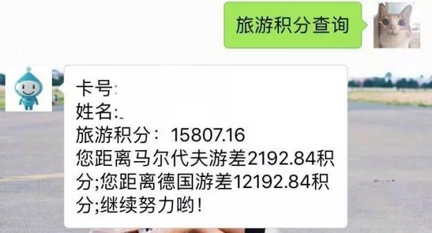 输入“旅游积分查询”,随时找小精灵查查自己的旅游积分吧,世界那么大,安然带你看世界。