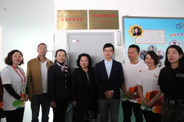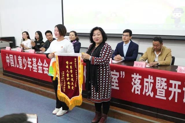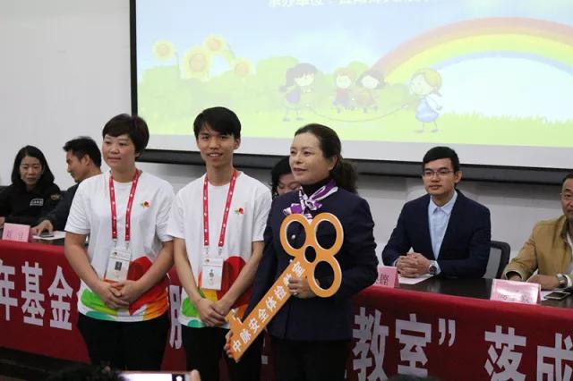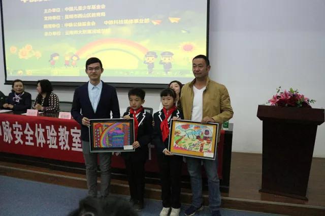 中国儿基会副主任黄焕铿和中脉科技美体事业代表吴丽妹向云南师大附属润城学校校长姜萍递交安全体验教室捐赠牌。
