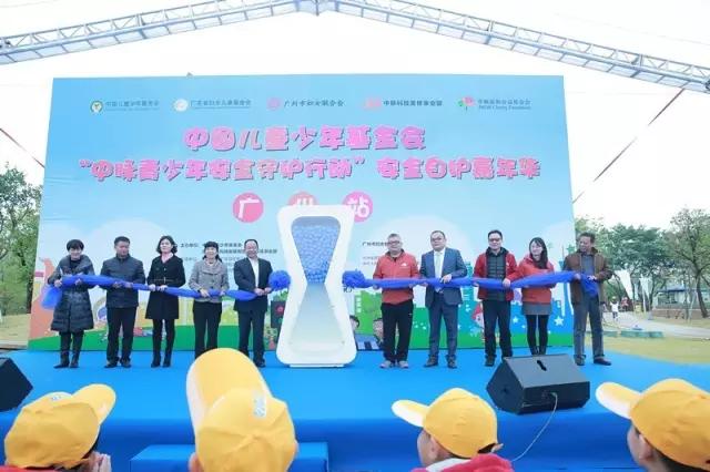 中国儿童少年基金会秘书长朱锡生(左五),中脉公益基金会主席周希俭(右五),中脉公益基金会理事邱伟杰(右四)共同开启中脉青少年安全守护行动—安全自护嘉年华广州站活动序幕