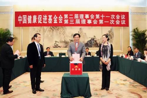 会议在民政部、国家卫生计生委宣传司领导及全体参会人员的见证下,经无记名投票选举产生了中国健康促进基金会第三届理事会,原总后勤部卫生部保监局局长王文中当选为新一届理事长,原军事医学科学院副院长徐卸古当选为常务副理事长兼秘书长,祖明军、韩萍、陈金焱当选为副理事长。会议对离任的第二届理事会理事、监事进行了表彰奖励,特别授予基金会创始人,第一、第二届理事长白书忠为“终身荣誉理事长”,第一、第二届副理事长陈义勤为“终身荣誉副理事长”,第一、第二届副理事长兼秘书长常映明为“终身荣誉副理事长兼秘书长”。