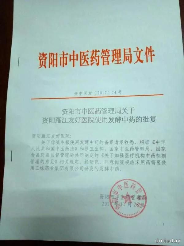 2017年11月28日,三株集团发酵中药正式被四川省资阳市中医药管理局列入雁阳友好医院临床用药!祝贺!