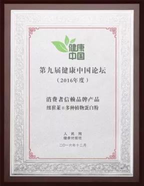 2016年12月,安利纽崔莱多种植物蛋白粉在北京举行的第九届健康中国论坛荣获“2016年度消费者信赖品牌产品”奖项。