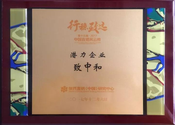 12月6日,由本质传媒、世界直销(中国)研究中心和《知识经济•中国直销》杂志联合主办的“行稳致远·第十三届(2017)中国直销风云榜”在重庆召开,在这场充满仪式感的直销行业荣耀盛典,浙江致中和生物工程有限公司获评2017中国直销潜力企业,致中和百年·致臻五加皮酒获得2017中国直销明星产品荣誉。
