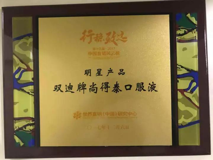 12月6日,由本质传媒、世界直销(中国)研究中心和《知识经济.中国直销》杂志联合主办“行稳致远.第十三届(2017)中国直销风云榜”在重庆召开,在这场充满仪式感的直销行业荣耀盛典中,双迪股份获评2017中国直销潜力企业荣誉大奖,双迪牌尚得泰核酸口服液荣获明星产品荣誉。