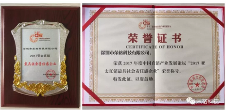 2017年12月8日—10日,被誉为“直销指南针·行业达沃斯”的第十三届中国直销产业发展论坛暨第二届直销产品博览会在北京成功举行。在本届大会颁奖盛典上,荣格及荣格总经理孙小玲女士分别凭借强烈的企业责任和出色的领导魅力荣膺了“2017亚太直销最具社会责任感企业”奖和 “2017亚太直销杰出企业家”奖。