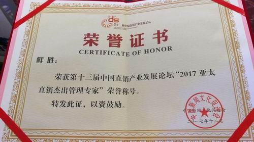 副董事长鲜胜先生荣获2017亚太地区直销行业杰出管理专家荣誉称号