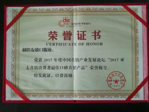 和治友德口服液荣获2017亚太地区直销行业消费者最佳口碑直销产品荣誉称号