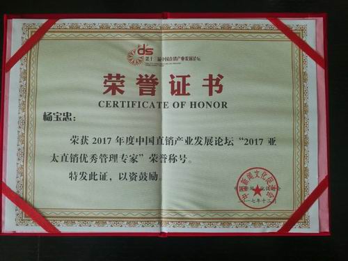 营销中心总经理、凤凰国际商学院院长杨宝忠先生荣获2017亚太地区直销行业优秀管理专家荣誉称号
