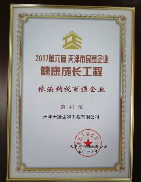 2017年12月15日,由天津市工商业联合会举办的2017天津市民营企业“健康成长工程”新闻发布会在津召开,天津天狮生物工程有限公司受邀参加,并于会上获颁“2017第六届天津市民营企业‘健康成长工程’依法纳税百强企业第41位”荣誉。