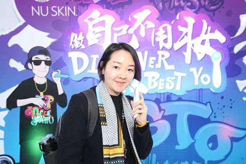 然而,在这个年末最受年轻人关注的音乐嘉年华现场,最让观众颠覆感官体验并为之讨喜的可算是最大展区了——NU SKIN如新的品牌专区,记者发现,专区不仅把现今非常流行的蓝粉渐变色充分展露,而且融入了嘻哈,涂鸦,电音等多种元素,在伴随着霓虹炫亮的灯光下既能将NU SKIN如新“You Revolution(由你创变)”的品牌调性诠释出来,还更好地从视觉上让热爱生活的年轻人一眼关注到“做自己,不用妆”六字口号,令人顿时产生了共鸣感。