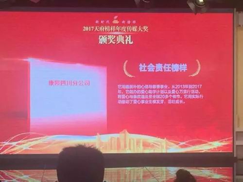 康婷公司四川省分公司荣获社会责任榜样奖,与2017年天府榜样评选的主题“新时代,新榜样”不谋而合。康婷公司四川省分公司不仅为用户提供了好的产品、好的服务,而且践行了康婷公司积极履行社会责任,以高度责任感和使命感积极回馈社会的宗旨,这个奖项也鞭策四川省分公司继续传播正能量,传递企业社会责任,传递康婷人求质创新的精神。