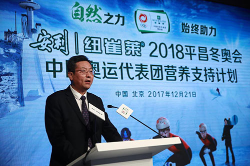 2017年12月21日,平昌冬奥会开幕倒计时50天。中国奥委会合作伙伴安利纽崔莱在国家体育总局北京体育馆大厅举行“安利纽崔莱2018平昌冬奥会中国奥运代表团营养支持计划”启动仪式。中国冬奥军团在备战平昌冬奥会期间,纽崔莱将为冰雪健儿们提供定制化的专业营养支持。中国奥委会市场开发部副主任王平、国家体育总局冬季运动管理中心副主任宏江、安利大中华首席市场营运官余放及中国花样滑冰名将隋文静、韩聪出席本次活动。