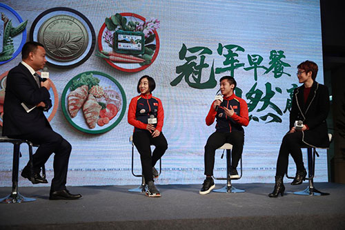 世界冠军隋文静、韩聪与主持人沙桐(左)、纽崔莱营养师李冬艳座谈