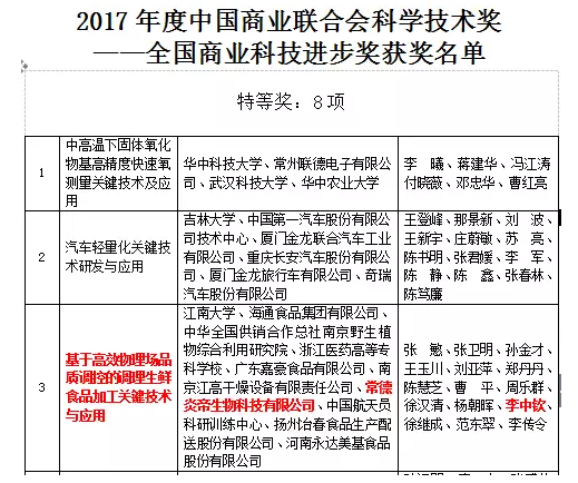在2017年12月20日中国商业联合会公布的“2017年度中国商业联合会科学技术奖”评选结果中,常德炎帝生物科技有限公司携手江南大学共同研发并申报的“基于高效物理场品质调控的调理生鲜食品加工关键技术与应用”赫然在列!且该项目被评为“2017年度中国商业联合会科学技术奖特等奖”!