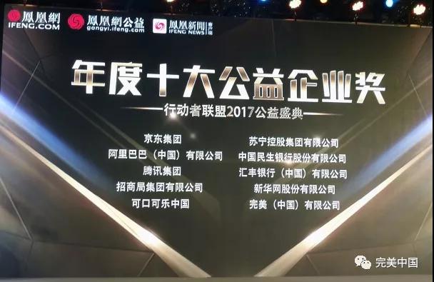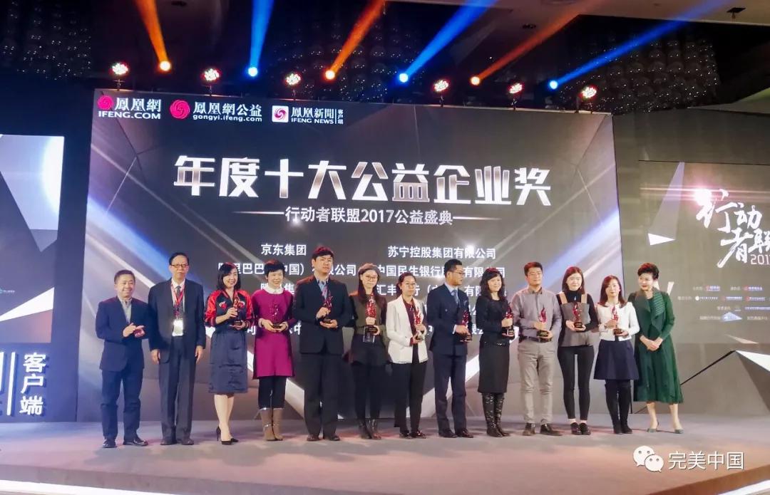 12月26日,由凤凰网主办、凤凰网公益承办的“行动者联盟2017公益盛典”颁奖典礼在北京举办。经过五个多月的角逐评选,完美(中国)有限公司凭借在企业社会责任及社会公益方面的突出贡献,从879个报名者中脱颖而出,荣获年度“十大公益企业”称号。