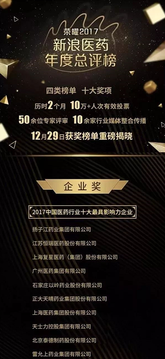 12月29日,历时2个月的报名筛选、网络投票以及专家评审,“荣曜2017·新浪医药年度总评榜”十大奖项重磅揭晓!以岭药业获评“十大行业最具影响力企业”。