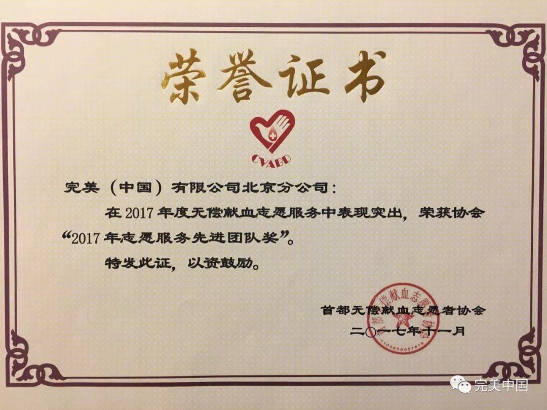 近日,北京市红十字血液中心在国家话剧院举行年度志愿者表彰活动,完美北京分公司荣获“2017年志愿服务先进团队奖”。