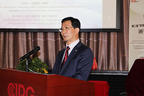 董总代表新时代健康产业集团讲话指出,书法和中医药都是中华优秀传统文化的重要组成部分,练习书法和传播中医药文化都是对中华民族优秀传统文化的继承与发展。新时代健康产业集团把中华优秀传统文化作为思想源泉和道德指引,“己欲立而立人,己欲达而达人”。希望同中国外文局人民画报社开展长期合作,共同办好欧亚国家书法大赛,“以字为媒”推动“一带一路”沿线国家间文化交流,促进民心相通、贸易畅通,实现央企健康产业和国家外宣媒体的强强联合,促成品牌共建,共襄发展盛举。