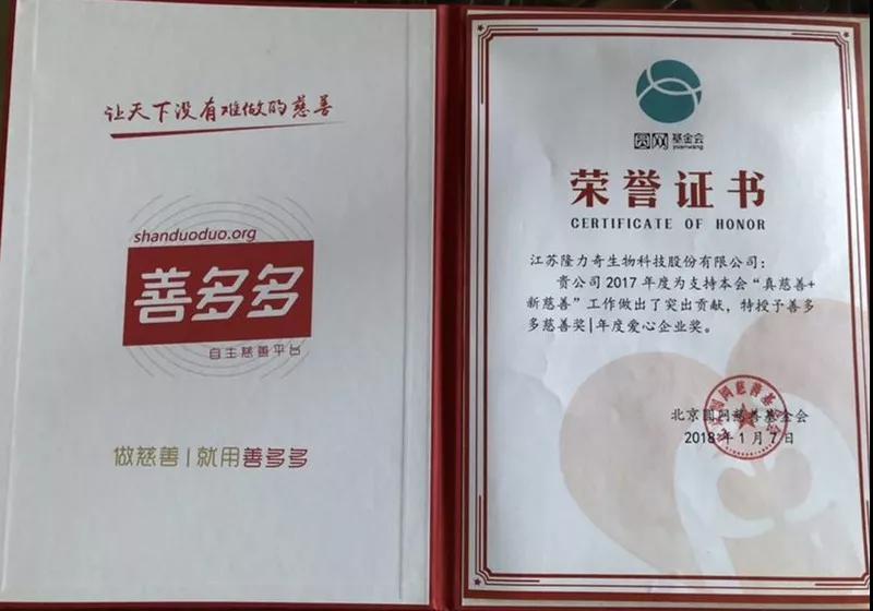 1月7日,善多多︱慈善盛典暨第9季“圆计划”千人出发大会在北京隆重举行。江苏隆力奇生物科技股份有限公司荣获圆网慈善基金“圆计划”2017年爱心企业奖。