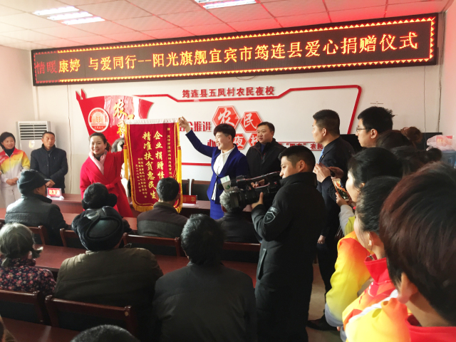 随后,筠连县筠连镇镇长周晓芳介绍了筠连县整体情况,筠连县属于省级贫困县,主要以农业、畜牧业为主,贫困家庭户数较多,政府计划在2018年摘掉筠连贫困县的“帽子”。筠连县五凤村支部书记赵友泽对困难家庭的情况作了介绍,并表示此次爱心捐赠的现金将以专项基金的形式存于镇财政托管的五凤村专户,贫困群众可以申请该专项基金,经过审批后发放给群众。为对康婷公司的善举表示感谢,赵友泽代表村支两委及贫困群众向康婷公司颁发了锦旗。