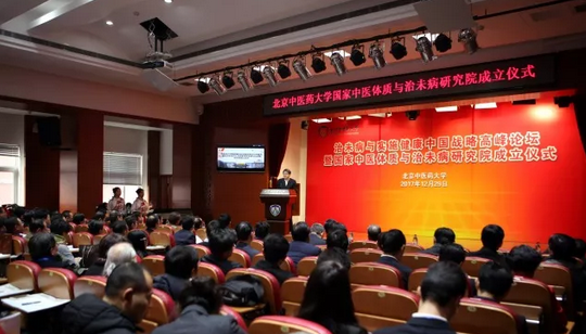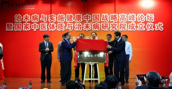 2017年12月29日上午,“治未病与实施健康中国战略高峰论坛暨北京中医药大学国家中医体质与治未病研究院成立及揭牌仪式”在北京举行。北京市中医管理局局长屠志涛,中国科学院院士陈凯先,中国工程院院士张伯礼、樊代明、程京;来自剑桥大学的樊台平教授、芝加哥大学的袁钧苏教授、香港大学的劳力行教授、澳门大学的王一涛教授;来自“健康中国——全国中医体质与治未病协作创新联盟”的29所兄弟院校嘉宾,国医大师王琦教授和师生代表共300余名嘉宾出席了开幕式。