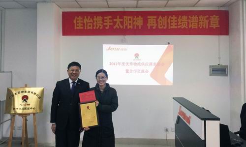 为表彰先进,树立服务标杆。会上,首先由韩总代表太阳神向佳怡物流合作伙伴颁发“2017财年优秀物流供应商”奖牌,表彰其在过去的一年来项目运营取得优异的成绩及长足的进步,祝贺佳怡物流连续三年荣获太阳神优秀物流供应商称号,并鼓励其继续稳步、持续优化,为客户提供更优质的物流服务。