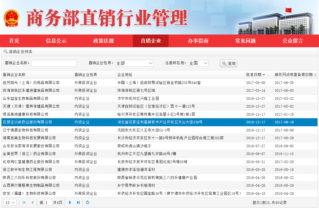 2018年1月18日,小编从商务部直销行业管理信息系统获悉,石家庄以岭药业股份有限公司已被正式录入直销企业名单。至此,正式拿牌企业已经达到90家了。