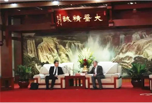 天士力控股集团战略投资事业群首席风控官王晨与宽腾医疗集团副总裁叶仲广就合作事宜进行沟通洽谈