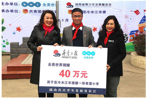 此次捐赠爱心企业全美世界为冷水江市中连乡杨家学校的改造慷慨捐赠40万元,将在该校新建一栋教学楼。据了解,学校现有6个班级,教师20人,学生150人左右,学校学生中约有40%的孩子是留守儿童。援建完成后,学生将达到300人左右。