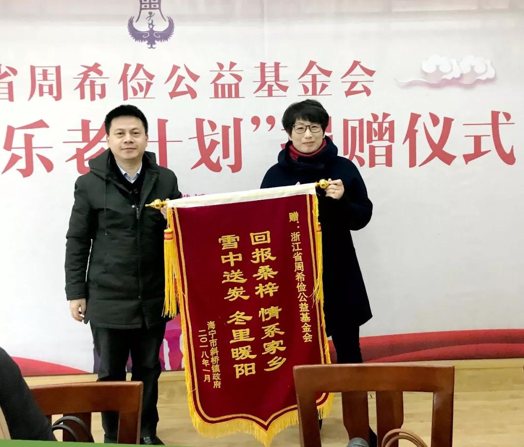 海宁市斜桥镇党委书记王建文为周希俭公益基金会理事长周俐赠送锦旗